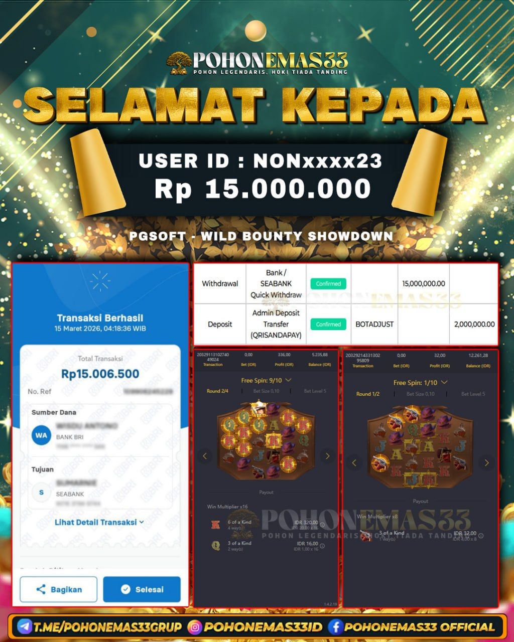 SELAMAT!! Kepada Member setia POHONEMAS33 telah berhasil menang besar di SLOT PG SOFT - WILD BOUNTY SHUTDOWN dengan USER ID : NONxxxx23
