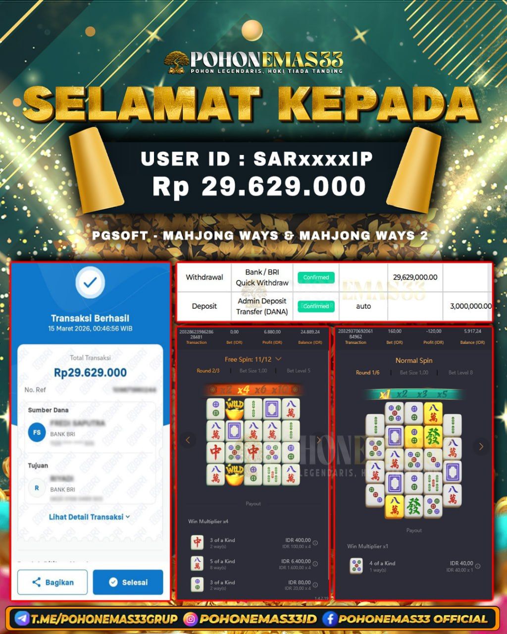 SELAMAT!! Kepada Member setia POHONEMAS33 telah berhasil menang besar di SLOT PG SOFT - MAHJONG WAYS & MAHJONG WAYS 2 dengan USER ID : SARxxxxIP