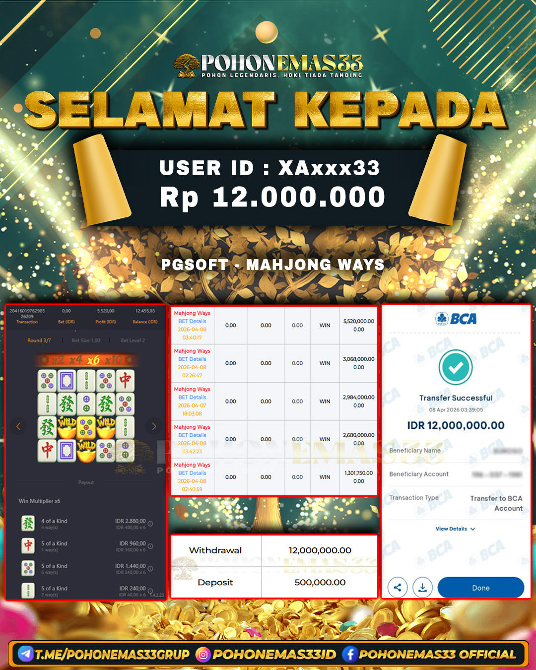 SELAMAT!! Kepada Member setia POHONEMAS33 telah berhasil menang besar di SLOT PGSOFT MAHJONG WAYS dengan USER ID : XAxxx33