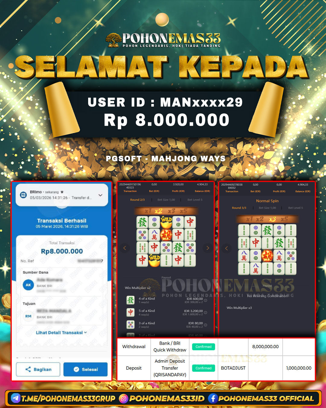 SELAMAT!! Kepada Member setia POHONEMAS33 telah berhasil menang besar di SLOT PGSOFT MAHJONG WAYS dengan USER ID : MANxxxx29