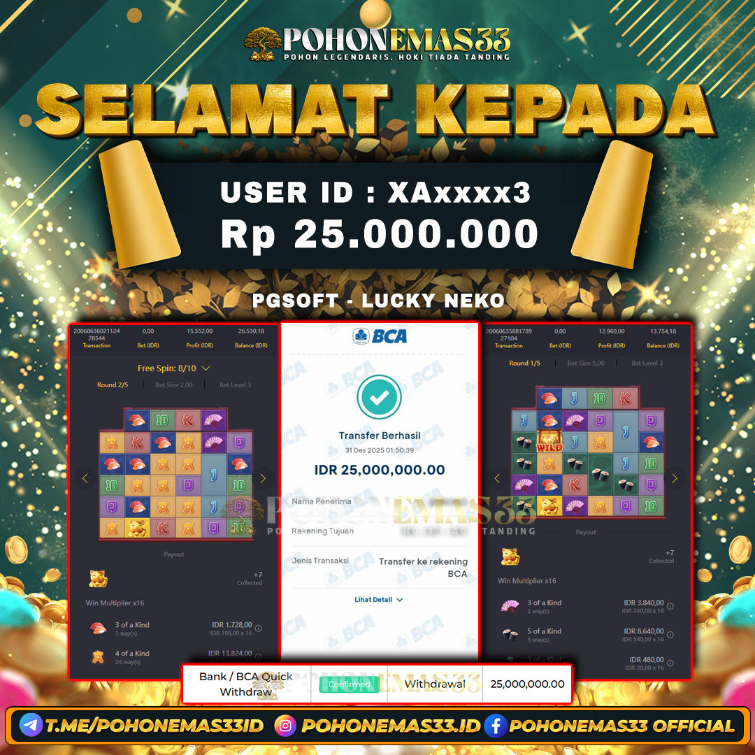 SELAMAT!! Kepada Member setia POHONEMAS33 telah berhasil menang besar di SLOT PGSOFT LUCKY NEKO dengan USER ID : XAxxxx3