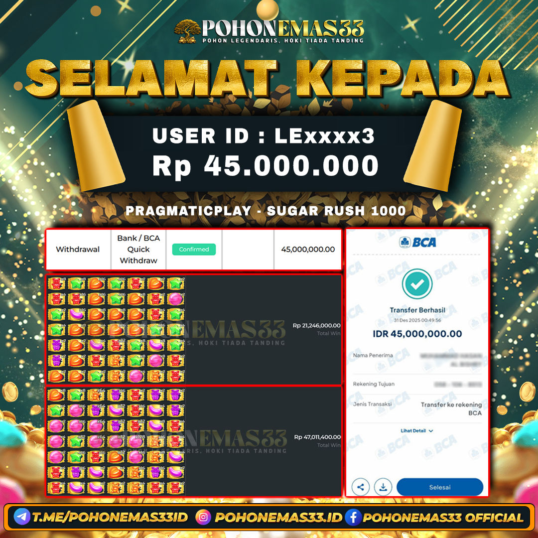 SELAMAT!! Kepada Member setia POHONEMAS33 telah berhasil menang besar di SLOT PRAGMATIC PLAY SUGAR RUSH 1000 dengan USER ID : LExxxx3